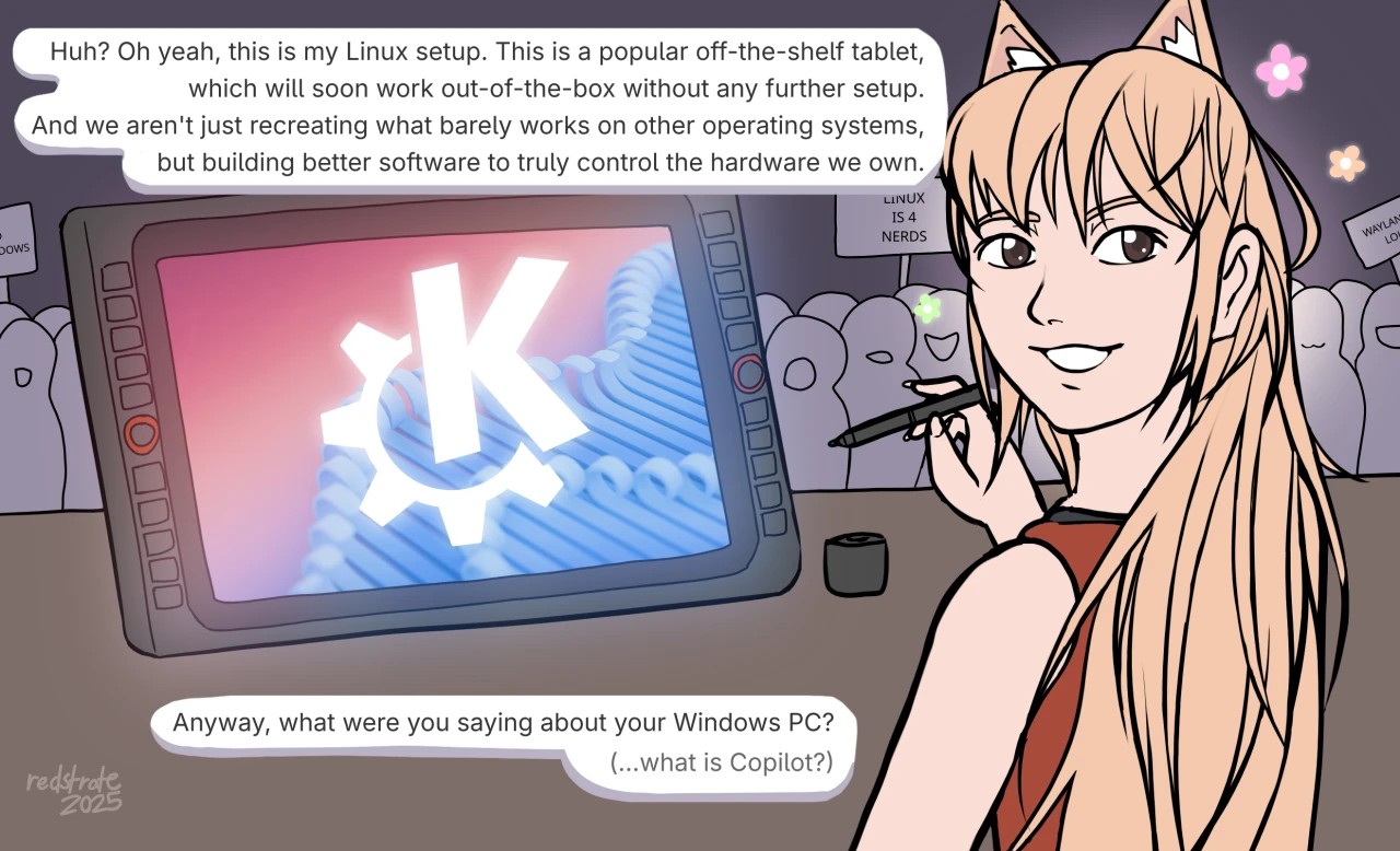 Wir können den Linux-Desktop nicht nur für Künstler nutzbar machen, sondern wir können ihn besser als alles andere da draußen machen. Keine beschissene Treibersoftware mehr, Tablets werden sofort mit einem Betriebssystem funktionieren, das einen wirklich respektiert ❤️