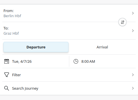 Die Benutzeroberfläche für die manuelle Suche nach öffentlichen Verkehrsmitteln wurde vereinfacht. Filter für bestimmte Verkehrsmittel befinden sich nun auf einer zweiten Seite, und Sie müssen nicht mehr im ersten Schritt eine Fahrt angeben, um die Ergebnisse hinzuzufügen. Stattdessen wird dies nun beim Speichern eines Ergebnisses abgefragt.
