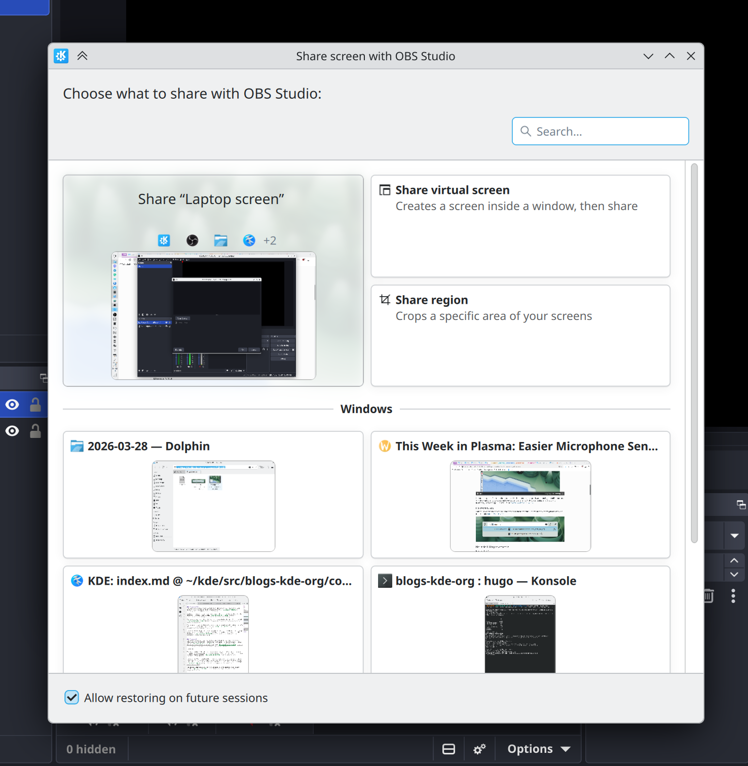 Die Benutzeroberfläche zur Bildschirmauswahl (z. B. für die Bildschirmfreigabe/das Casting) bietet nun ansprechendere Darstellungen der Bildschirme, wobei deren Hintergrundbilder im Hintergrund angezeigt werden. (Harald Sitter, xdg-desktop-portal-kde MR #532 and plasma-workspace MR #6409)