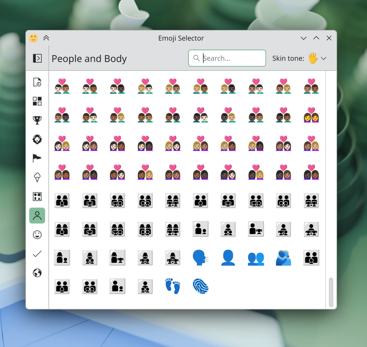 Im Emoji-Auswahlfenster können Sie nun über ein kleines, benutzerfreundliches Popup-Fenster Emojis mit gemischten Hautfarben auswählen. (Tobias Ozór, plasma-desktop MR #3426)