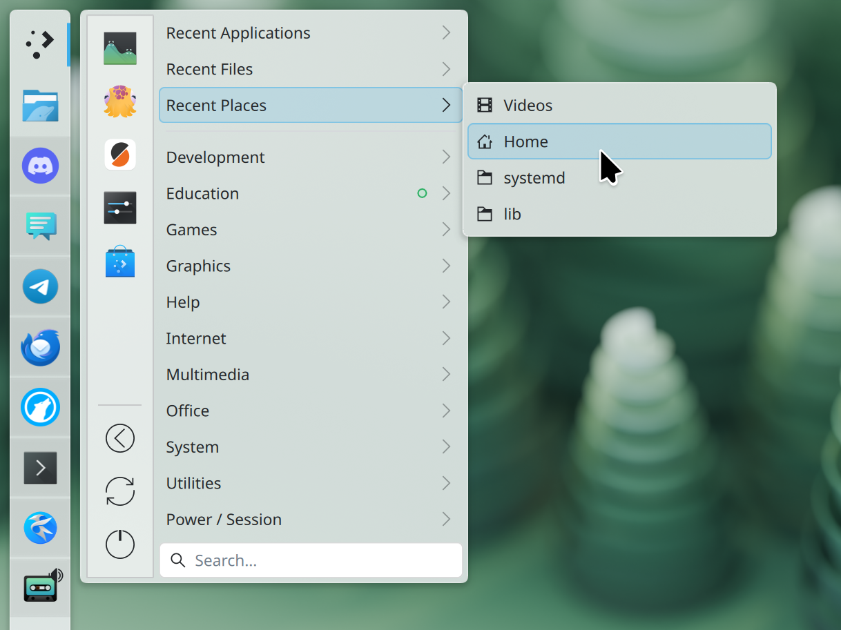 Das Widget „Anwendungsmenü“ von Kicker kann nun so konfiguriert werden, dass es den Eintrag „Zuletzt verwendete Orte“ anzeigt. (Christoph Wolk, KDE Bugzilla #420951)