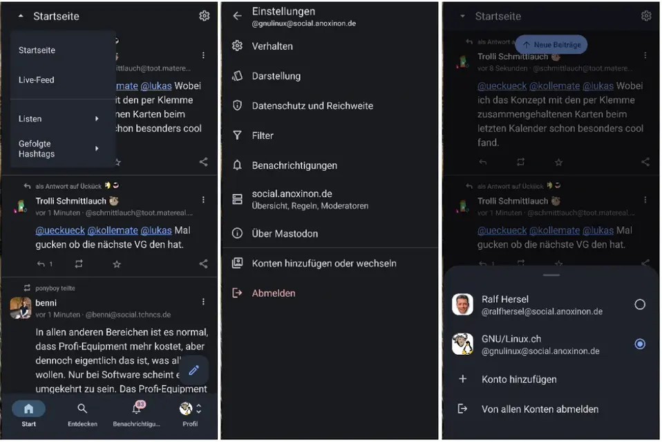 Der Client unterstützt mehrere Mastodon-Konten, zwischen denen man mit einem Links-Wischer wechseln kann. Die Steuerleiste für die verschiedenen Timelines kann in der Position (oben, unten) eingestellt werden. Welche Timelines man überhaupt sehen möchte, kann ebenfalls konfiguriert werden. Um eine Timeline zu aktualisieren, tippt man einfach auf das zugehörige Timelime-Icon. Anderssprachige Tröts kann man übersetzen lassen;