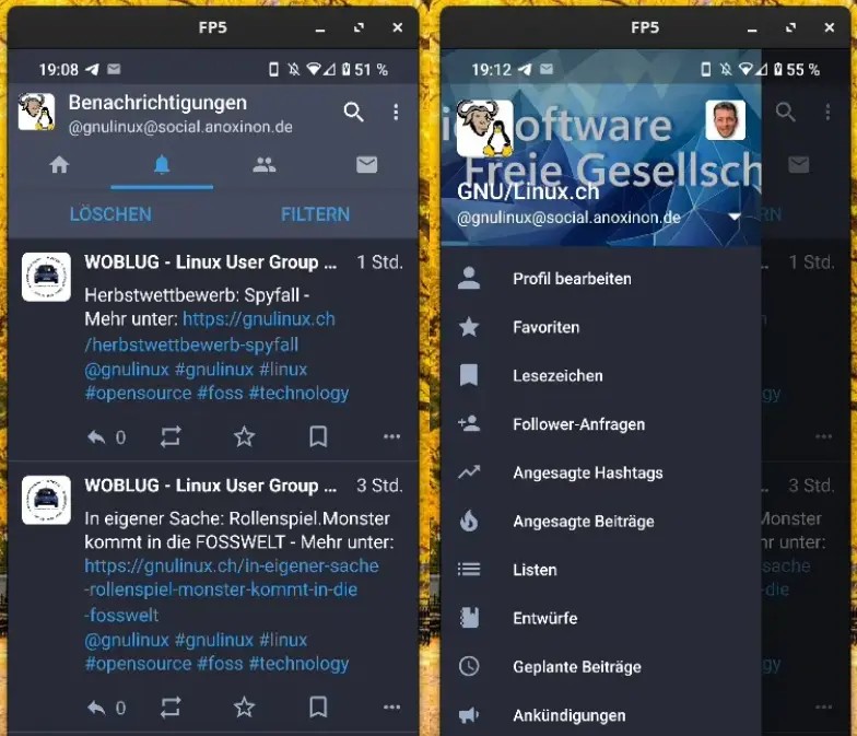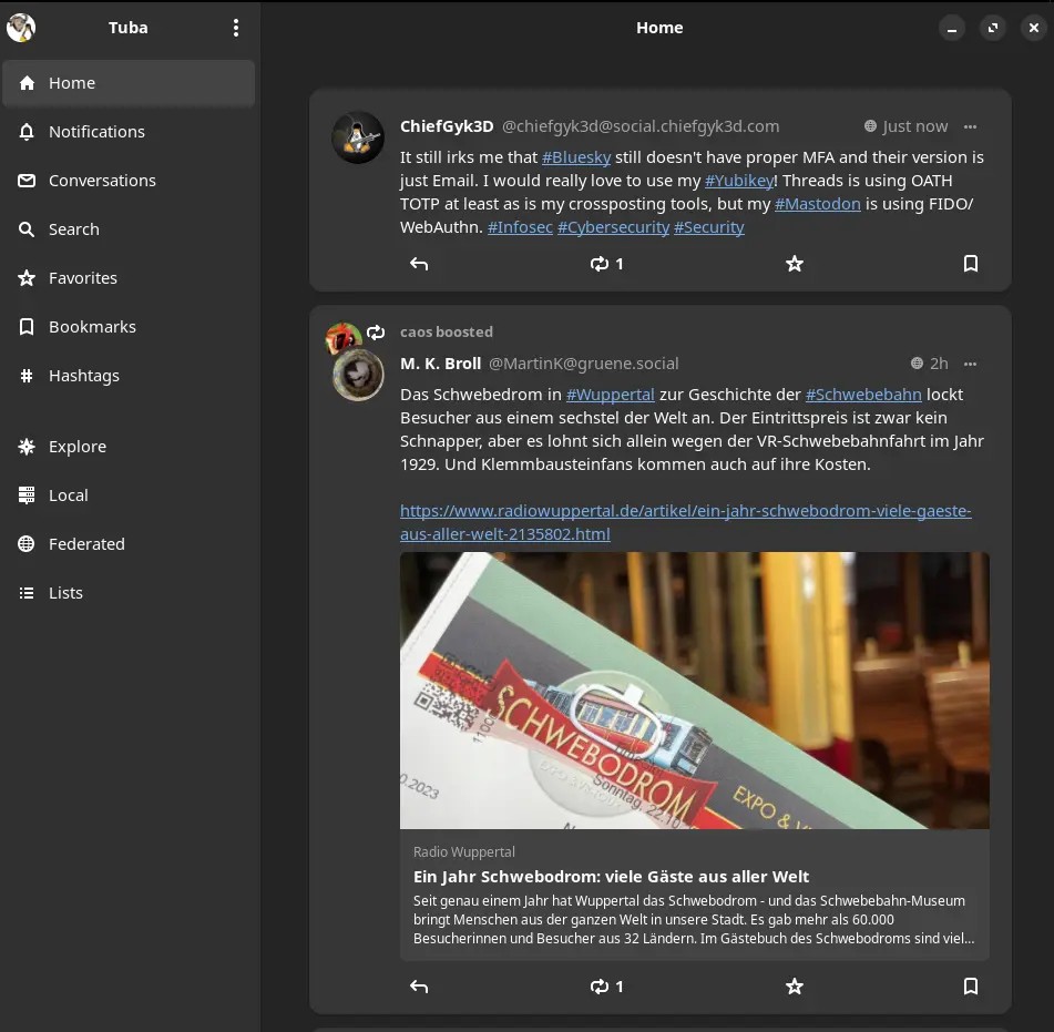 Ansonsten habe ich an Tuba nichts auszusetzen. UI und UX sind gut; die Abdeckung der Mastodon-Funktionen ist ausreichend; lediglich die Startgeschwindigkeit der Anwendung ist etwas lahm; das mag jedoch subjektiv sein; mir dauert das Starten fast aller Anwendungen zu lange.