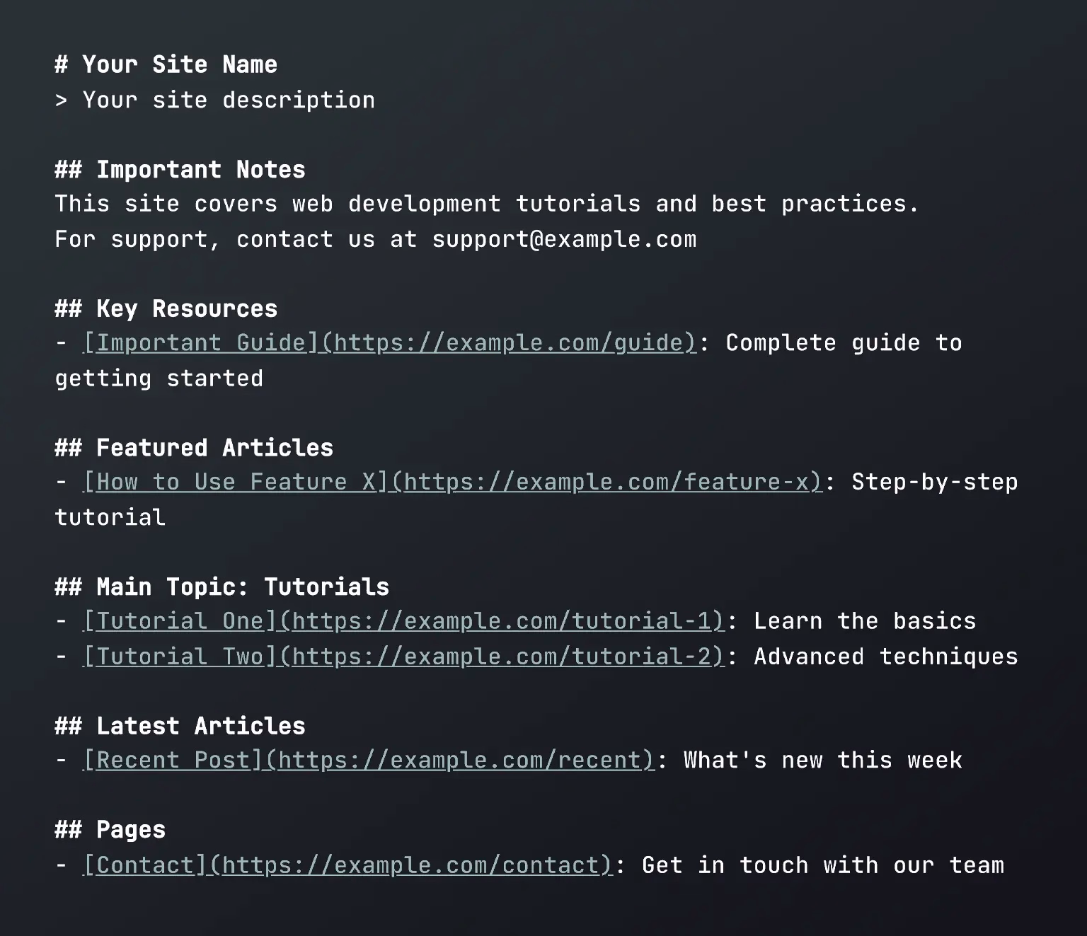 Die endgültige Datei llms.txt erscheint im Stammverzeichnis Ihrer Website neben index.html und ist unter IhreWebsite.com/llms.txt zugänglich. Der gesamte Prozess findet während der Erstellung statt – ohne Laufzeitaufwand, ohne JavaScript, nur eine statische Datei, die bei jeder Website-Generierung automatisch aktualisiert wird.